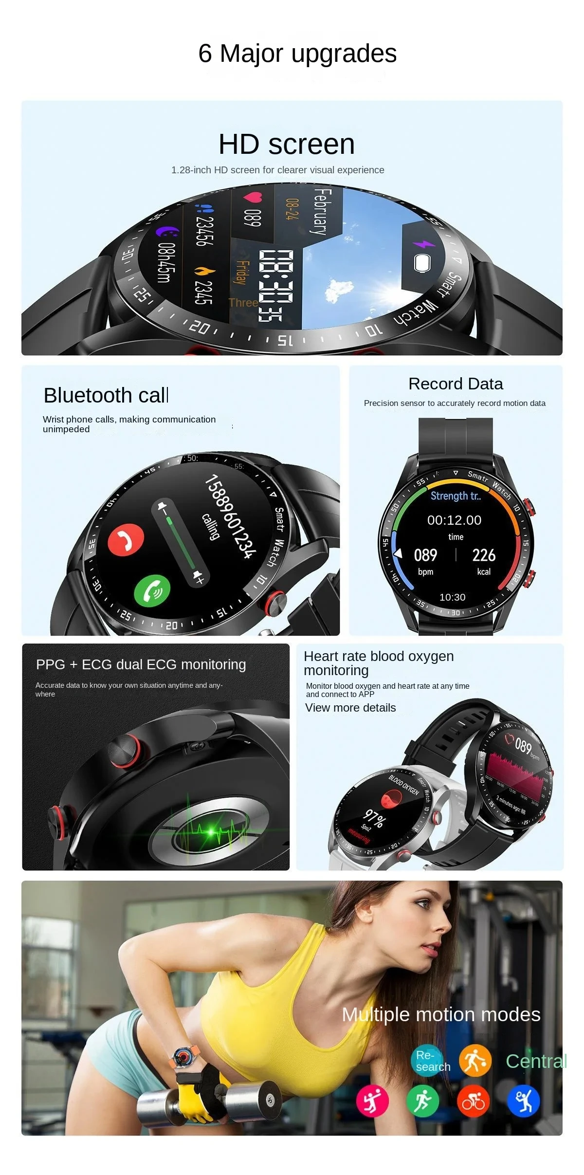 Recevoir/rejeter des appels téléphoniques/composer un appel téléphonique, surveillance de la fréquence cardiaque, surveillance de la pression sanguine/oxygène sanguin, surveillance du sommeil, rappel de sédentarité, podomètre de ports/consommation de calories/enregistrement de piste/temps d’exercice, rappel et affichage d’appel, message est poussé et affiché, Caméra télécommandée, mesure automatique de la fréquence cardiaque, multisports, mesure, rappel d’horloge, rappel d’alarme, 4 types de cadrans par défaut.Les cadrans de montre personnalisés via l’application sont facultatifs.test ECG