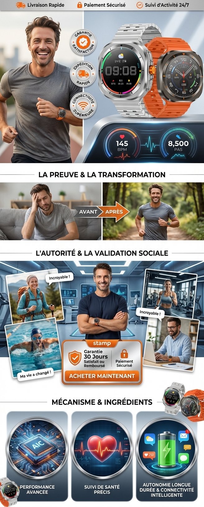La Z7 Ultra ne se contente pas d’être élégante : elle est aussi intelligente. Grâce à sa boussole intégrée et son mode outdoor, elle devient votre compagnon idéal pour vos aventures. Son système de suivi santé en